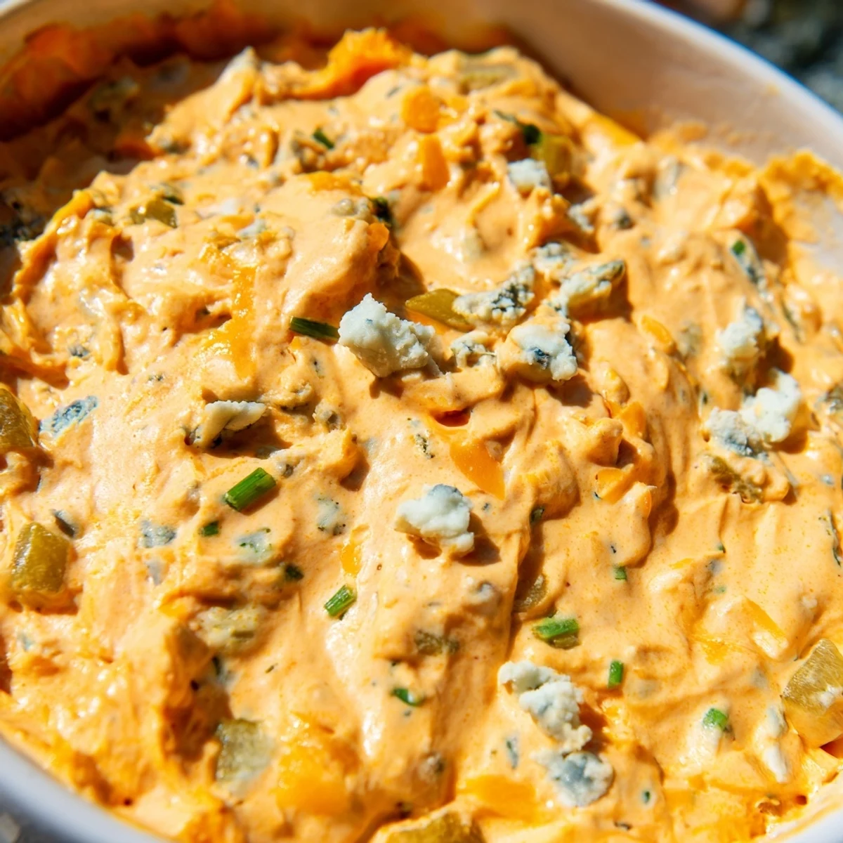 Shredded cheddar and optional blue cheese add richness, while fresh chives, garlic powder, and chopped pickles deliver layers of flavor and texture. The result is a crowd-pleasing dip that balances heat with briny tang—ideal for serving alongside chips, pretzels, or crisp vegetable sticks at your next gathering.