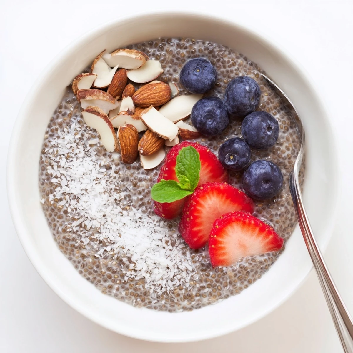 Whisk chia seeds with almond milk, maple syrup and vanilla, then rest to thicken. After an initial stir, chill for at least 2 hours or overnight until silky. Serve cold with berries, nuts, coconut or mint. Swap in coconut milk for richness, adjust sweetener to taste, or layer with fruit puree for parfaits. Keeps up to 4 days refrigerated.