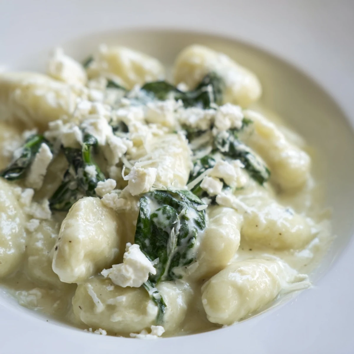 Soft potato gnocchi float to the surface in just minutes, then get enveloped in a luxurious heavy cream sauce that's been infused with aromatic garlic and sweet sautéed onions. Fresh baby spinach wilts into the rich base, adding vibrant color and nutrients, while crumbled feta brings its signature salty tang that perfectly balances the creamy elements.