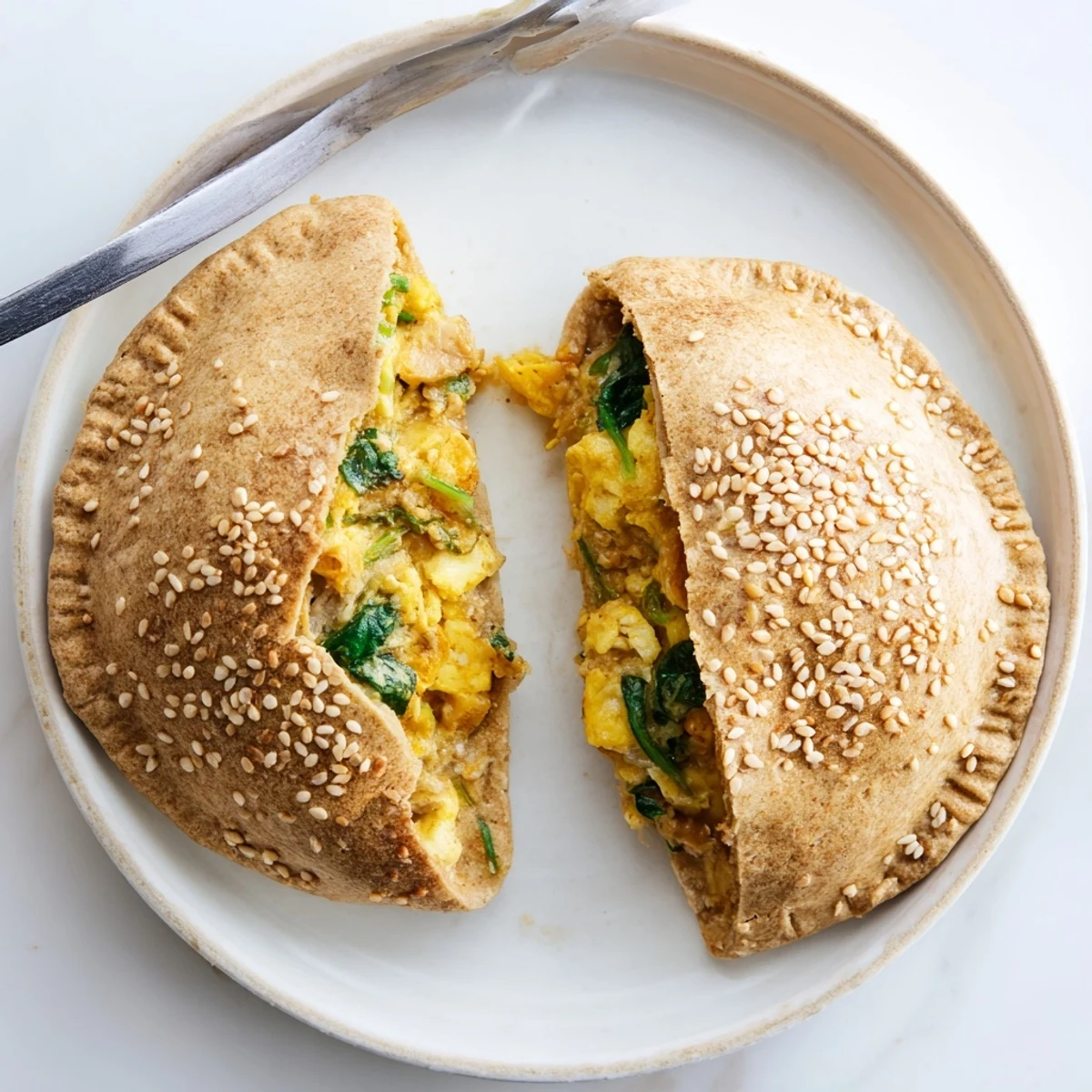 These handheld breakfast pockets combine a simple two-ingredient whole wheat dough with a protein-rich filling of scrambled eggs, lean turkey breast, reduced-fat cheddar, and fresh spinach. The Greek yogurt-based dough comes together in minutes without yeast, while the filling can be prepped ahead for busy weekday mornings. Each golden, flaky pocket delivers 19 grams of protein, making them ideal for meal prep or on-the-go breakfasts. Customize with different vegetables, cheeses, or proteins to suit your taste.